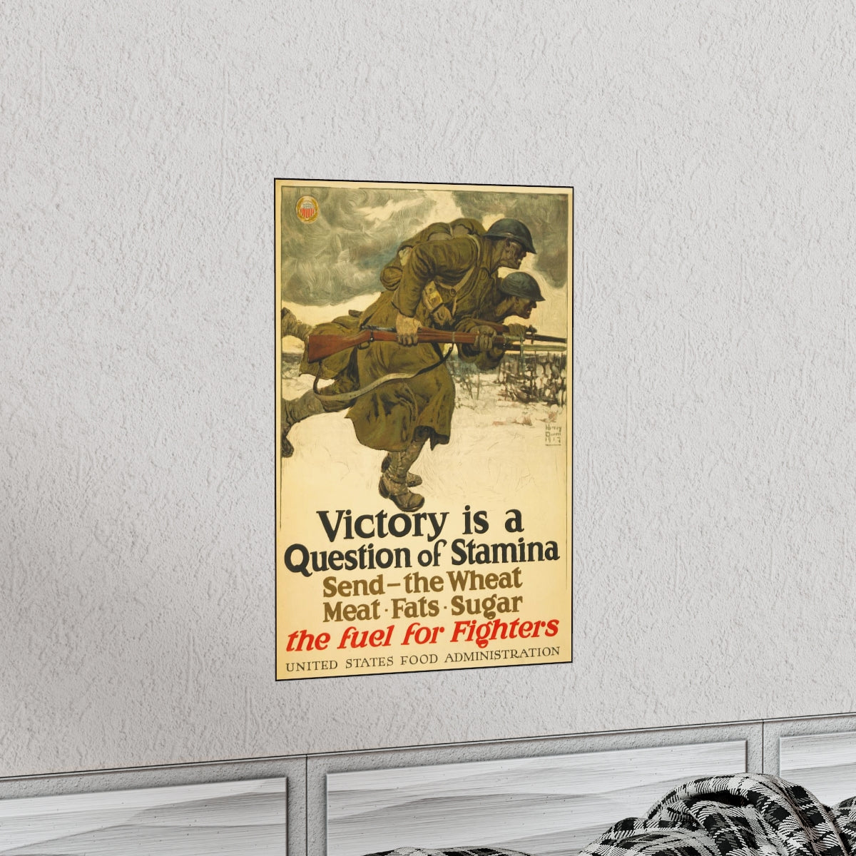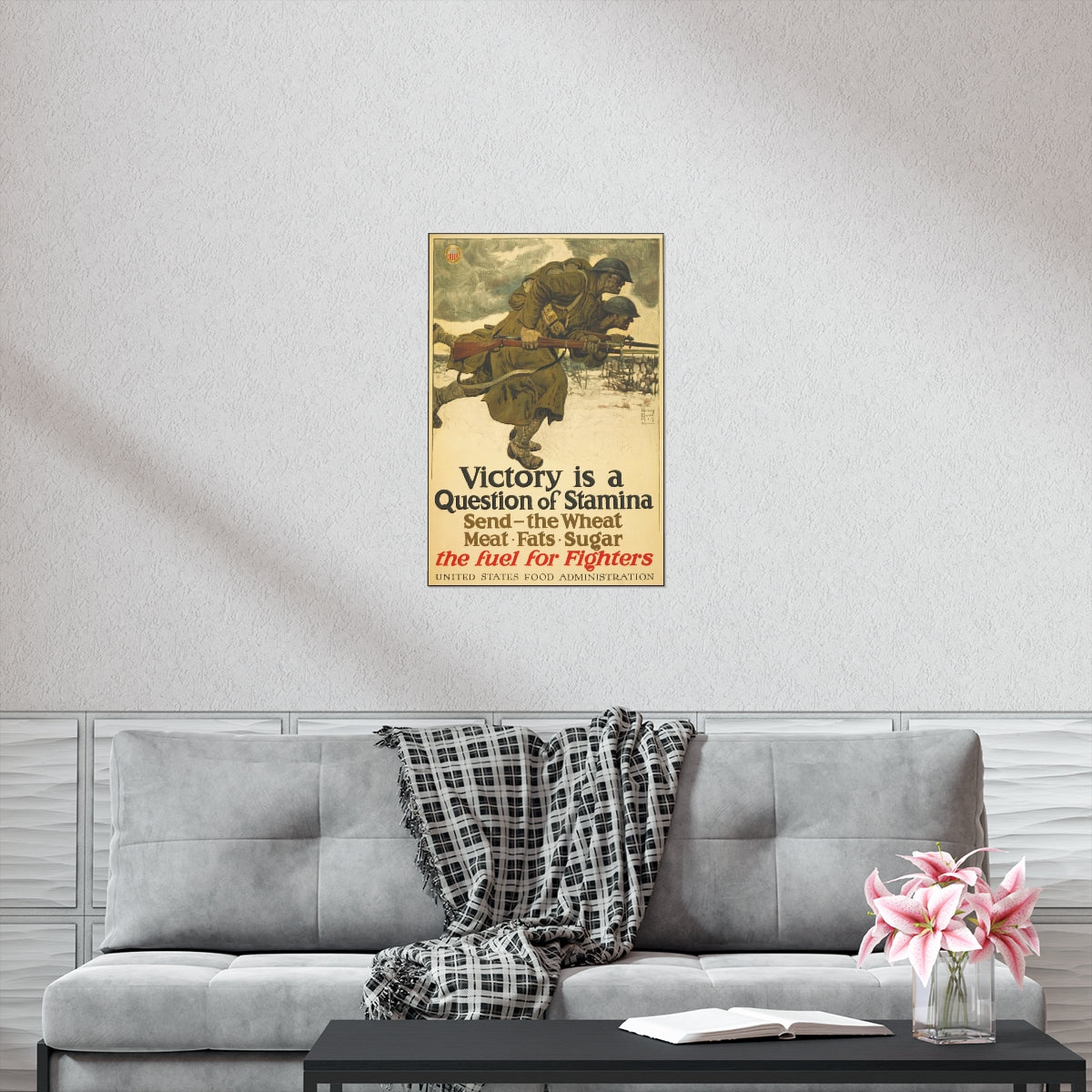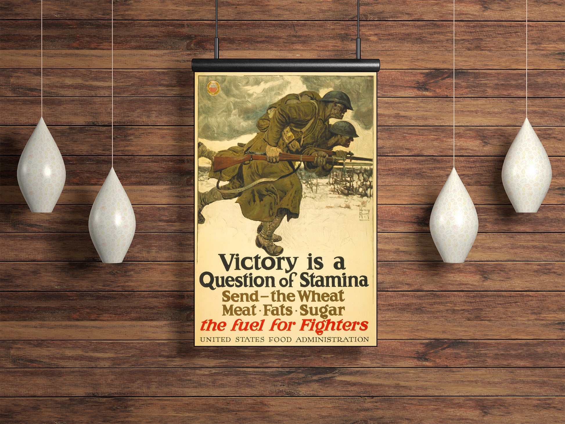 "Victory Is A Question of Stamina" reads this food conservation poster from the US Food Administration that was created during World War 1. The subheading reads "Send the Wheat * Meat * Fats * Sugar. The fuel for fighters" Posters like this were widely distributed during the great war. The goal was to encourage American civilians to consume more vegetables and foods that can be grown at home so that the wheat and protein-heavy foods could be sent to the men at the front.. The artwork depicts two doughboys running across no man's land with rifles in hand and bayonets attached. The original artwork was done by artist Harvey Dunn. The poster was originally published in 1917. A great gift for any war history aficionado! I digitally restore the raw scans of these 100+ year old posters and make them much more suitable for printing, but I do my best to keep them as close to original as possible. The original posters were approximately 20" x 30" NOTE: This listing is just for the poster reprint and is not framed. It will come rolled in a shipping tube.