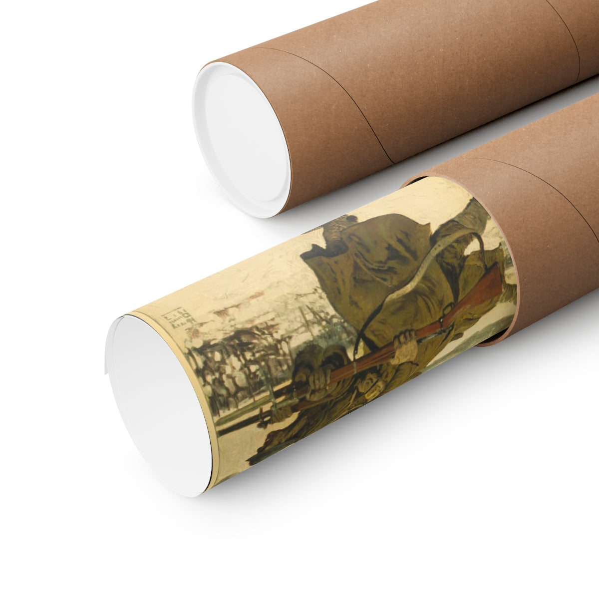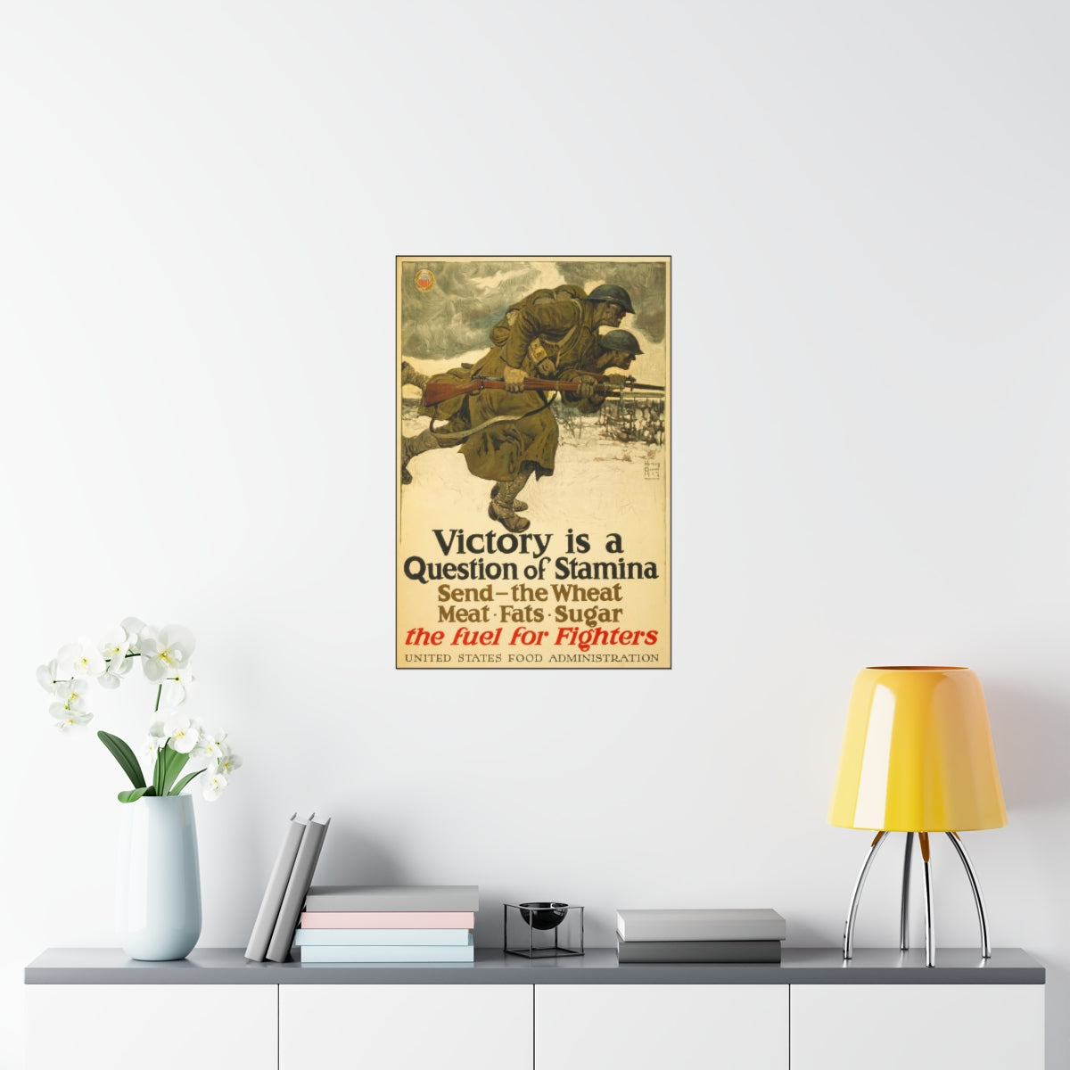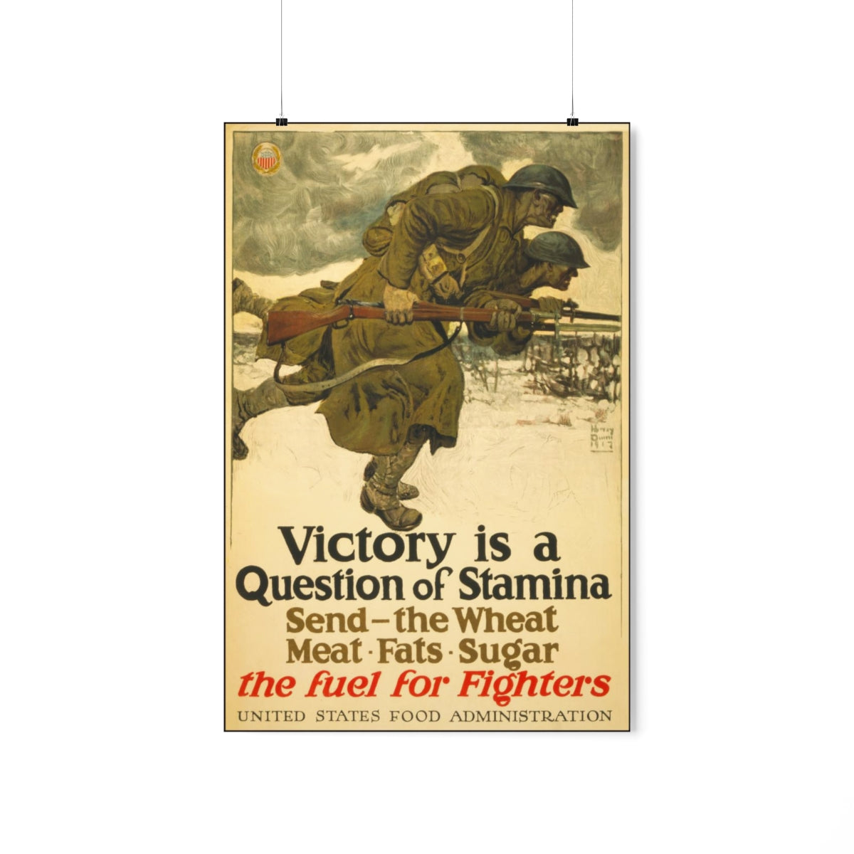 "Victory Is A Question of Stamina" reads this food conservation poster from the US Food Administration that was created during World War 1. The subheading reads "Send the Wheat * Meat * Fats * Sugar. The fuel for fighters" Posters like this were widely distributed during the great war. The goal was to encourage American civilians to consume more vegetables and foods that can be grown at home so that the wheat and protein-heavy foods could be sent to the men at the front.. The artwork depicts two doughboys running across no man's land with rifles in hand and bayonets attached. The original artwork was done by artist Harvey Dunn. The poster was originally published in 1917. A great gift for any war history aficionado! I digitally restore the raw scans of these 100+ year old posters and make them much more suitable for printing, but I do my best to keep them as close to original as possible. The original posters were approximately 20" x 30" NOTE: This listing is just for the poster reprint and is not framed. It will come rolled in a shipping tube.