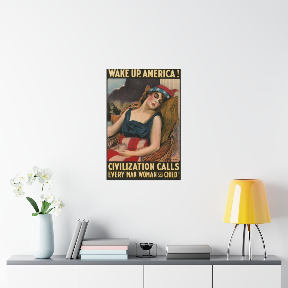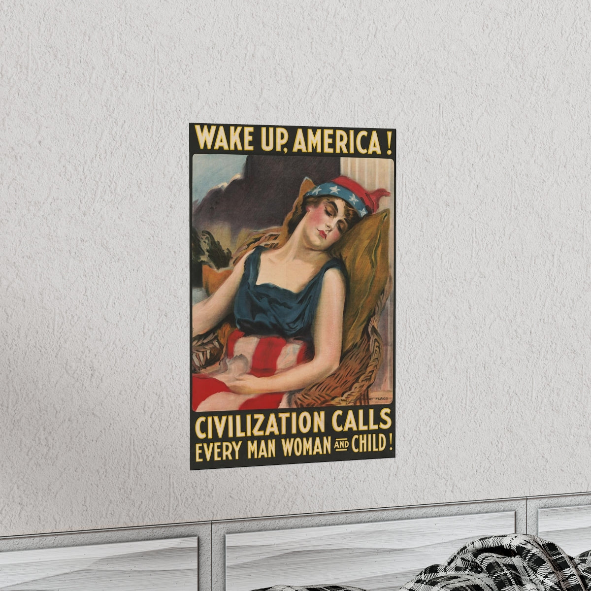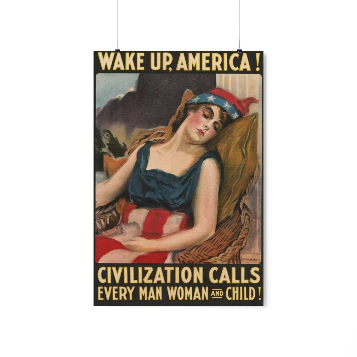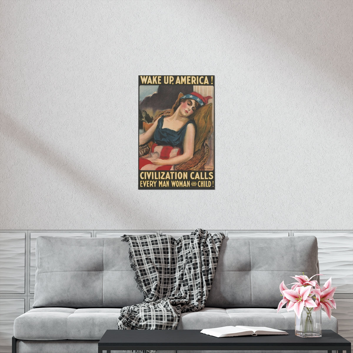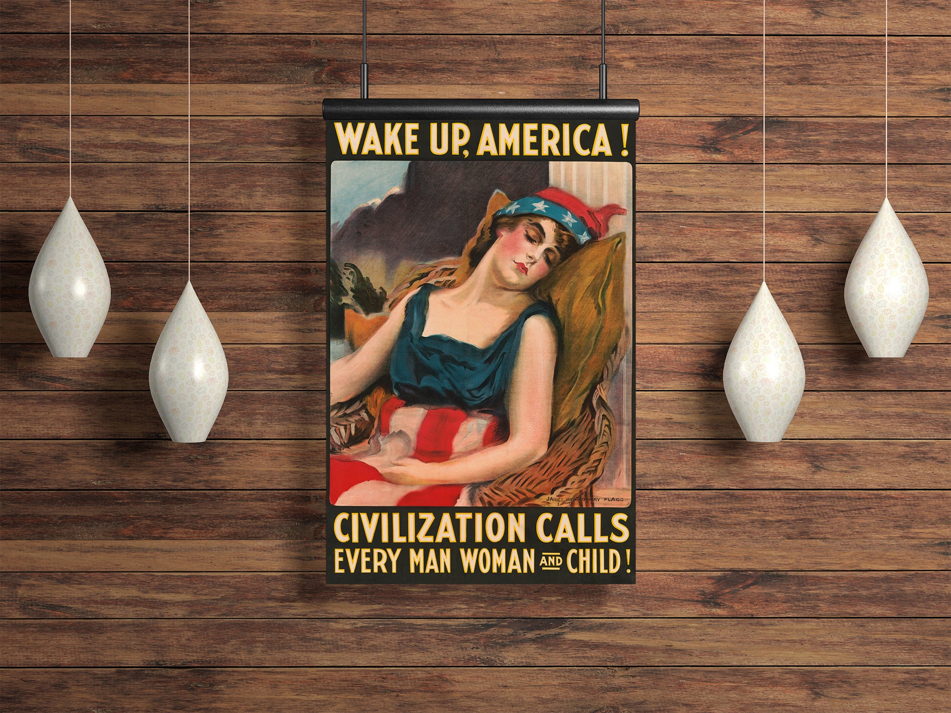 "Wake Up, America!" reads this military recruitment poster from the US government that was created during World War 1. The subheading reads "Civilization calls every man woman and child!" Posters like this were widely distributed, designed to bolster support for the war efforts. It depicts Lady America sleeping in stars & stripes garb while storm clouds loom on the horizon. America remained neutral in the war until 1917; joining the Allied side three years after hostilities began. The artist was James Montgomery Flagg. The poster was originally published in 1917. A great gift for any war history aficionado! I digitally restore the raw scans of these 100+ year old posters and make them much more suitable for printing, but I do my best to keep them as close to original as possible. The original posters were approximately 20" x 30" NOTE: This listing is just for the poster reprint and is not framed. It will come rolled in a shipping tube.