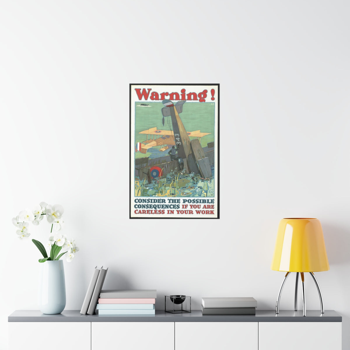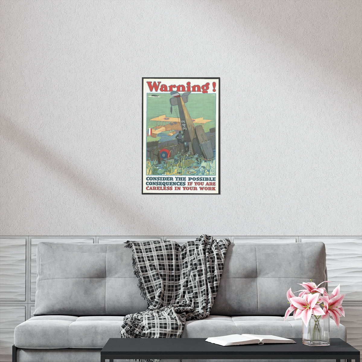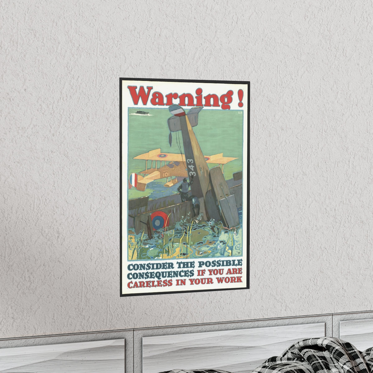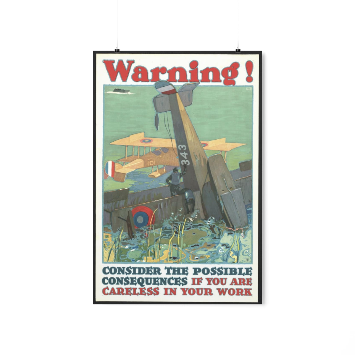 "Warning!" reads this poster from the US government that was created towards the end of World War 1. The subheading reads "Consider the possible consequences if you are careless in your work". Posters like this were widely distributed during the war. The artwork depicts a wrecked biplane (presumably caused by carless work), a pilot, and rescue plane. The original artwork was done by artist L.N. Britton. The poster was originally published in 1917. A great gift for any war history aficionado! I digitally restore the raw scans of these 100+ year old posters and make them much more suitable for printing, but I do my best to keep them as close to original as possible. The original posters were approximately 20" x 30" NOTE: This listing is just for the poster reprint and is not framed. It will come rolled in a shipping tube.